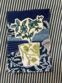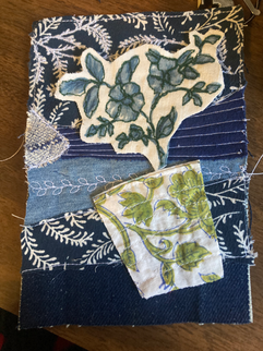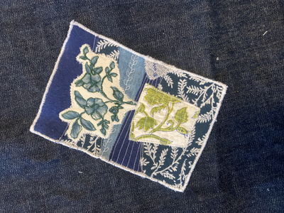 Appliqué: I am also playing around with using some layered decorative stitching pieces as appliqué in the little postcard studies. This evolved out of the mending technique I developed for my denim jacket last week (and week, primarily uses the swatch and scraps from that project).