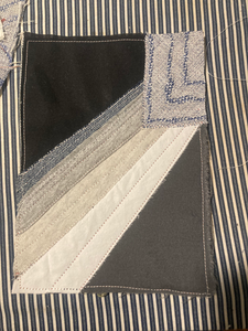 On Sunday I went back into my big bag of scraps for some more scrappy quilting. I also wanted to do something with the floral embroidery sample swatch I had made when mending the jacket, so I made that into a little appliqué layer.